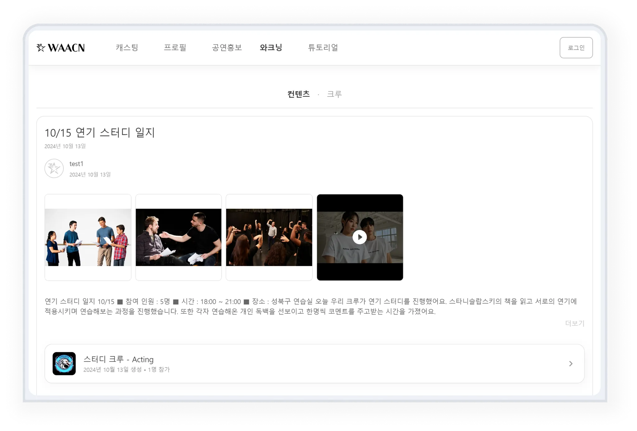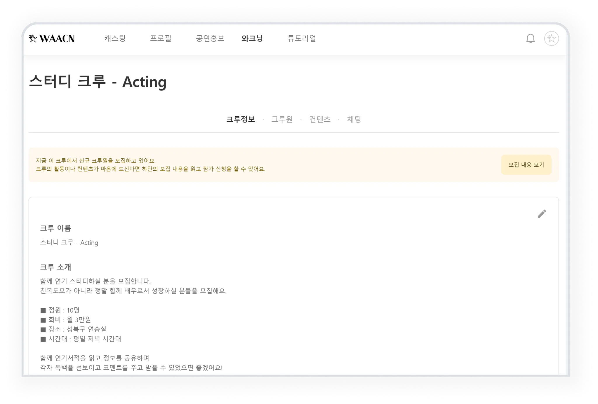 크루원들과 함께한 활동을 컨텐츠란에 홍보하고 기록해보세요.