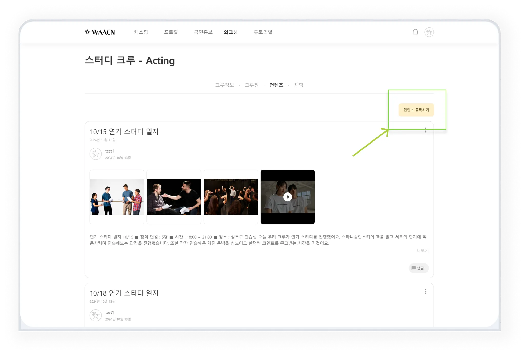 본인이 소속된 크루방에 컨텐츠를 등록해보세요.