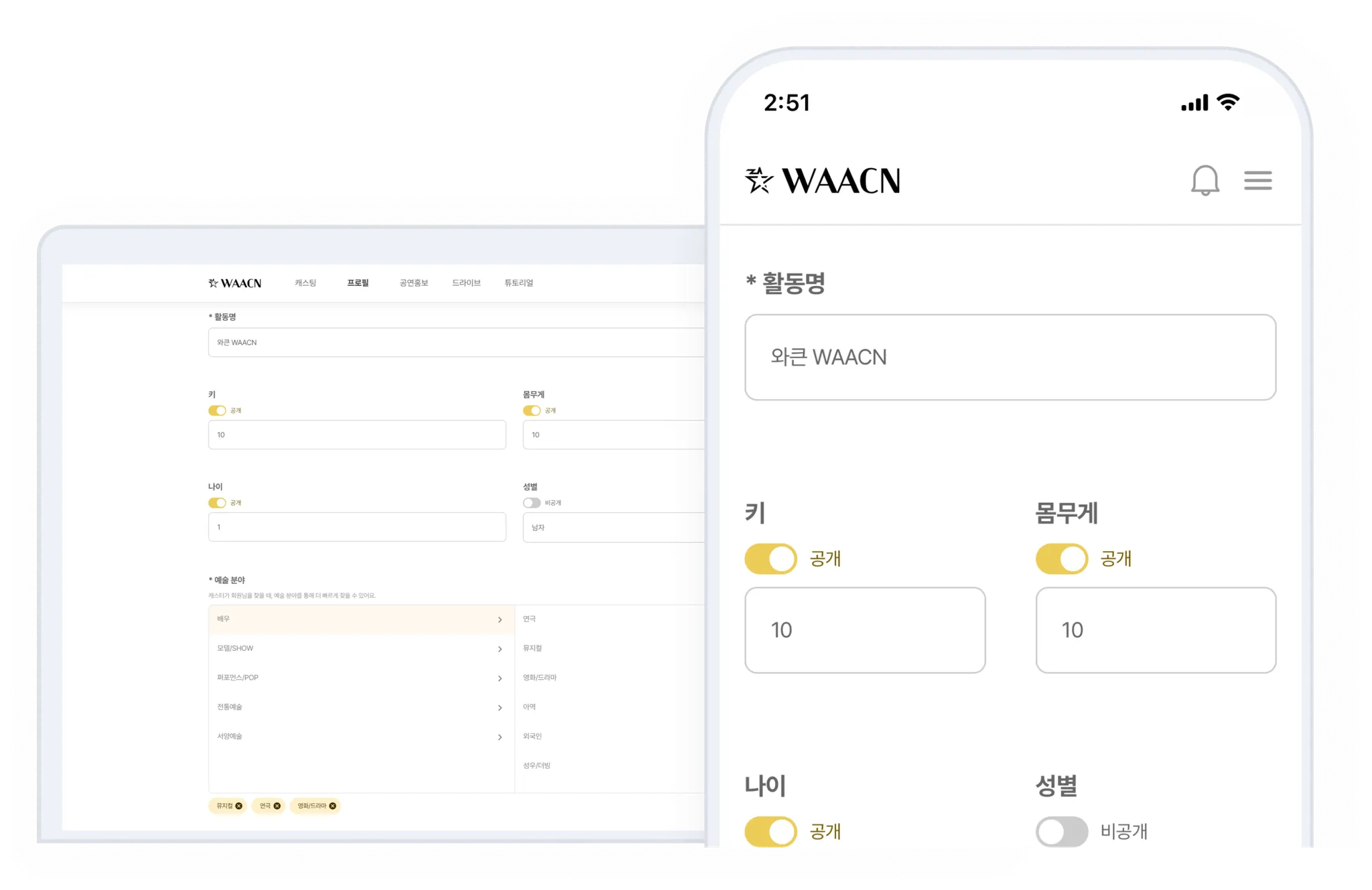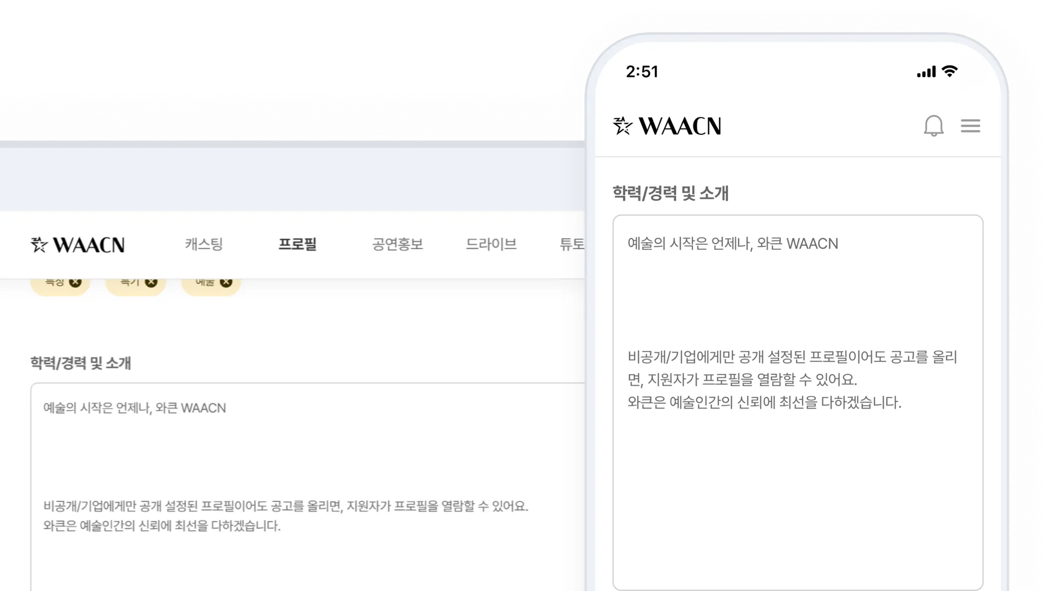 와큰만의 깔끔한 양식으로 정리되는 나만의 프로필을 꾸며보세요.