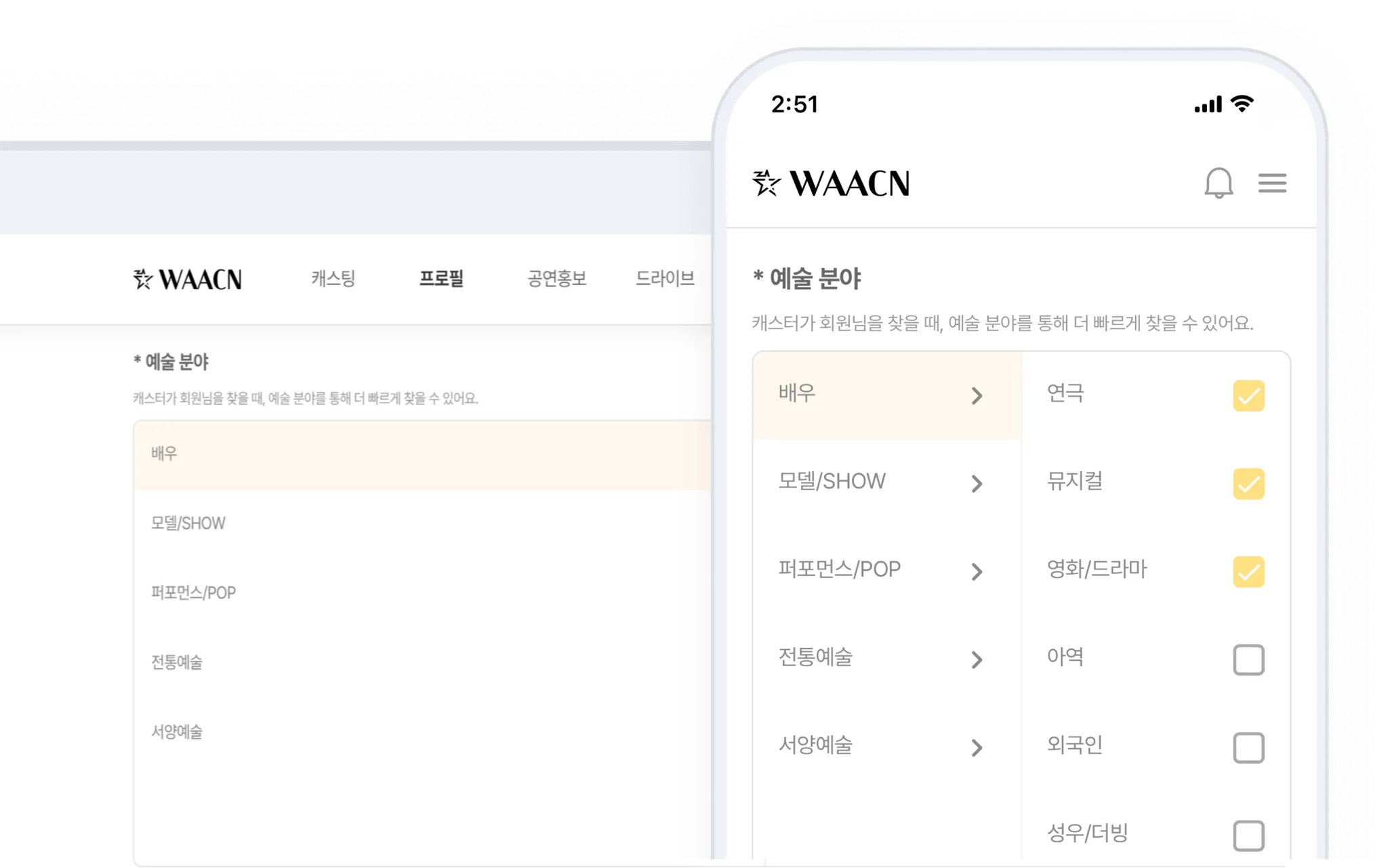 캐스터가 회원님을 찾을 때, 예술 분야를 통해 더 빠르게 찾을 수 있어요.
